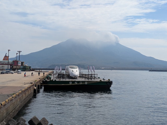 陸路の新幹線が船で海を渡る景色はなかなか見れることじゃない。しかもここは桜島が目前。